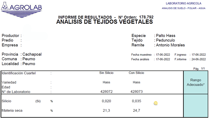 - Resistencia a heladas: Los análisis confirmaron que los aportes de silicio aumentaron su contenido en el pedúnculo del fruto, junto con la materia seca, lo que se tradujo en una disminución del daño por heladas.