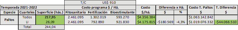 Considerando el aumento de producción de 4.000 kg/ha y un retorno neto promedio de exportación estimado en 1,5 US/kg, la inversión generó un retorno adicional de US 6.000 por hectárea. Esto se traduce en una relación beneficio/costo de 6 dólares ganados por cada 1 invertido, validando la viabilidad económica de las estrategias implementadas.